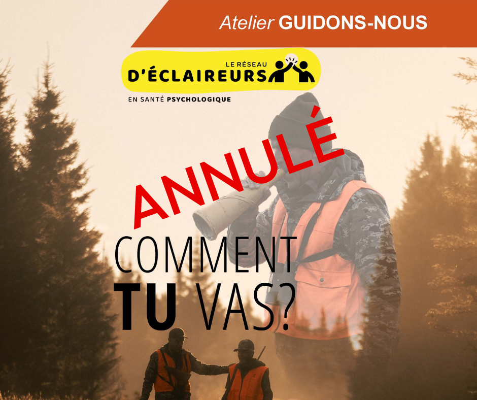 ANNULÉ Organisée par le réseau d'éclaireurs CISSS des Laurentides Inscriptions au 819 681-2161 poste 2258 ou loisirsculture@mont-blanc.quebec Cet atelier est basé sur le visionnement de la vidéo GUIDONS-NOUS avec Michel Ther-rien présentant le témoignage de ce guide de chasse et criminologue de formation qui a lui-même vécu un deuil par suicide. Le récit permet de […]